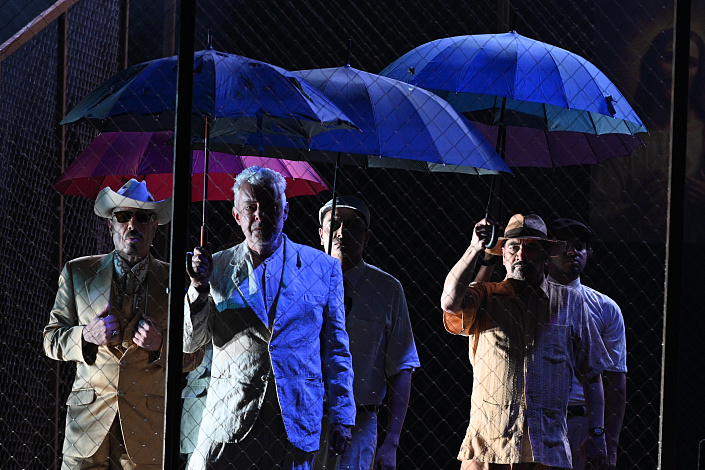The show, an adaptation of the eponymous book of Gabriel Garcia Marquez (the writer’s grandfather, a civil war veteran, was the prototype of the main character), tells the story of an old Colonel who is awaiting his retirement pension for 15 years, yet no official letters arrive. The plot centers on his life in poverty with his ailing wife, the memory of his deceased son, and the fighting rooster left by his son, which becomes a symbol of hope and dignity for the hero. The action is structured by the director as a series of colonel’s dialogues – with his wife and with the rooster – accompanied by live music.