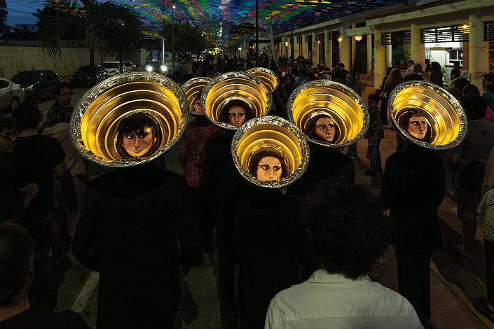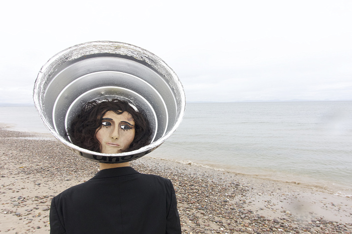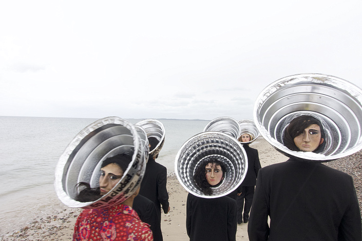 «Те, кто из-за моря» созданы из противоречий. В них уживается невозможное: предельная уязвимость и ледяная учтивость. Они — зеркало, в котором отражается «потерянный» человек современной цифровой эпохи. Встречая их, невозможно сразу понять, что ты испытываешь: чувство радости, неловкости, любопытства или острое желание бросить все и пойти за ними. Их облик говорит сам за себя: темные костюмы, обувь, из которой выглядывают пальцы ног, и вместо привычных головных уборов — промышленные алюминиевые щитки. Защита, ставшая короной.